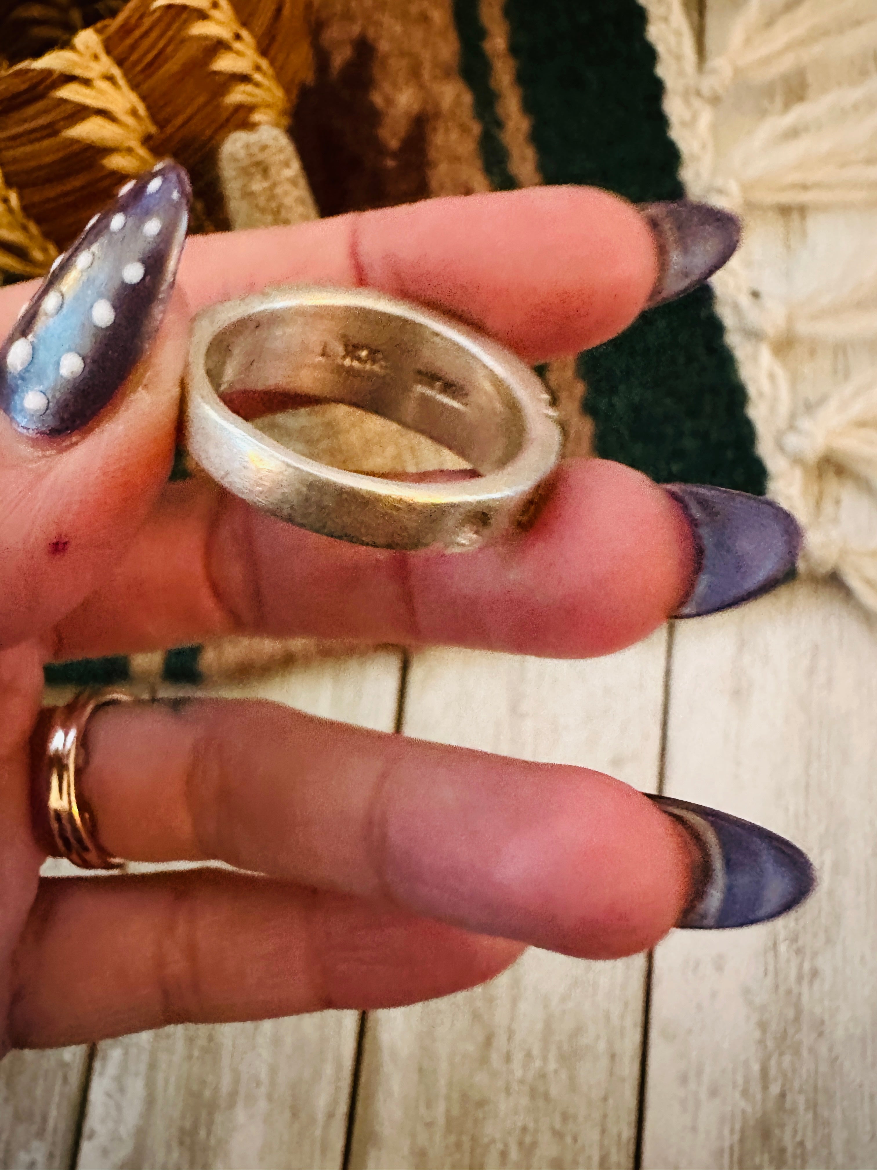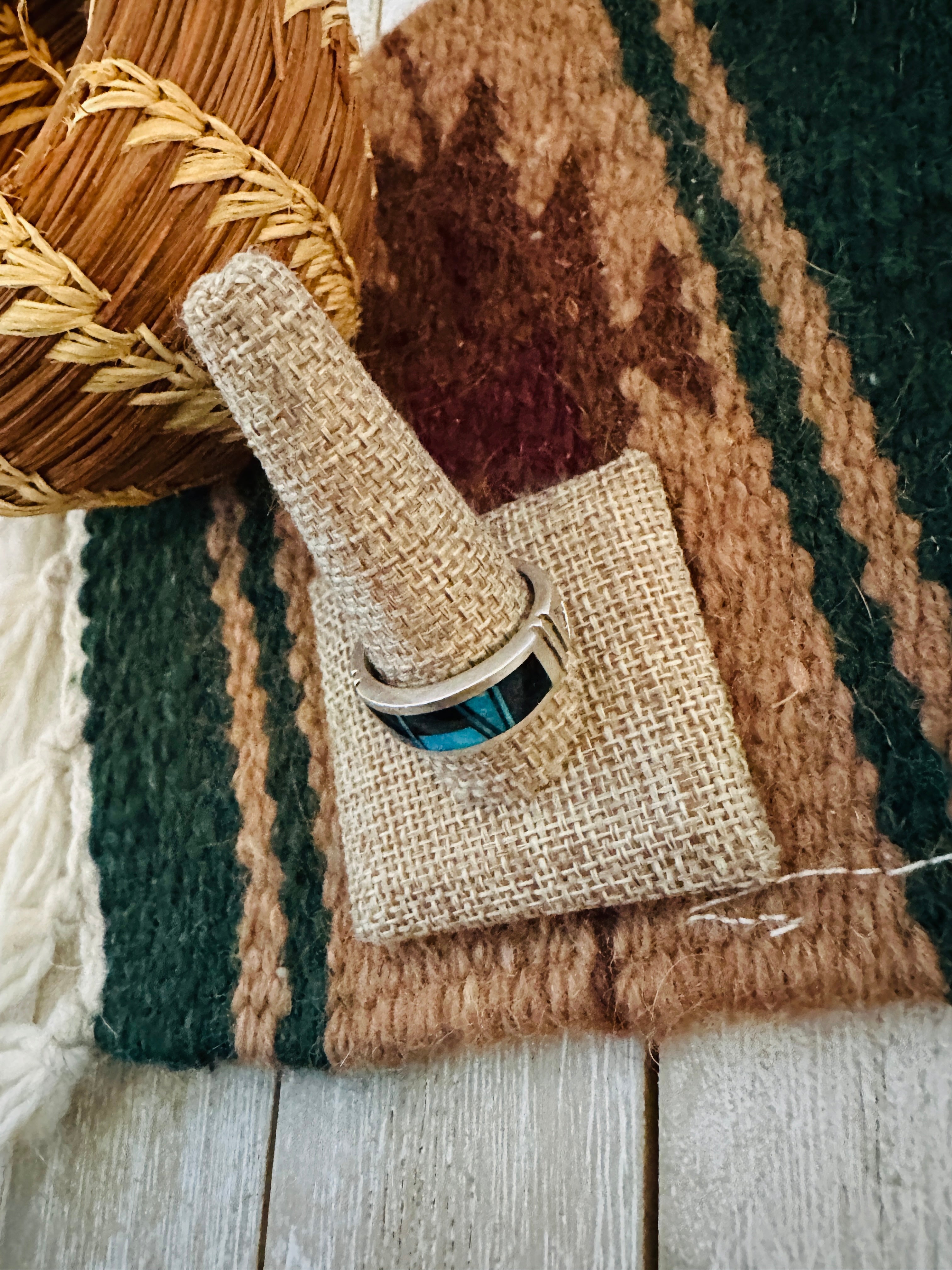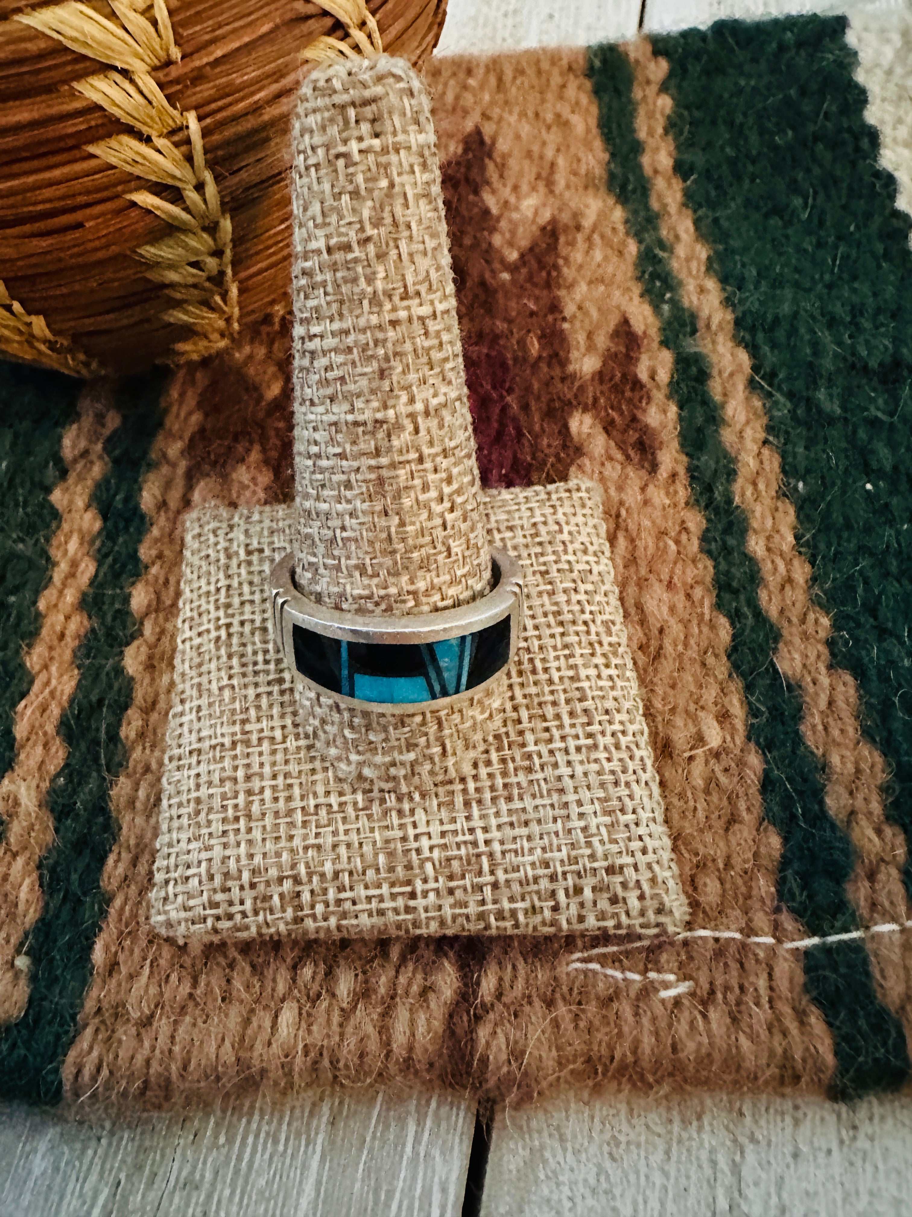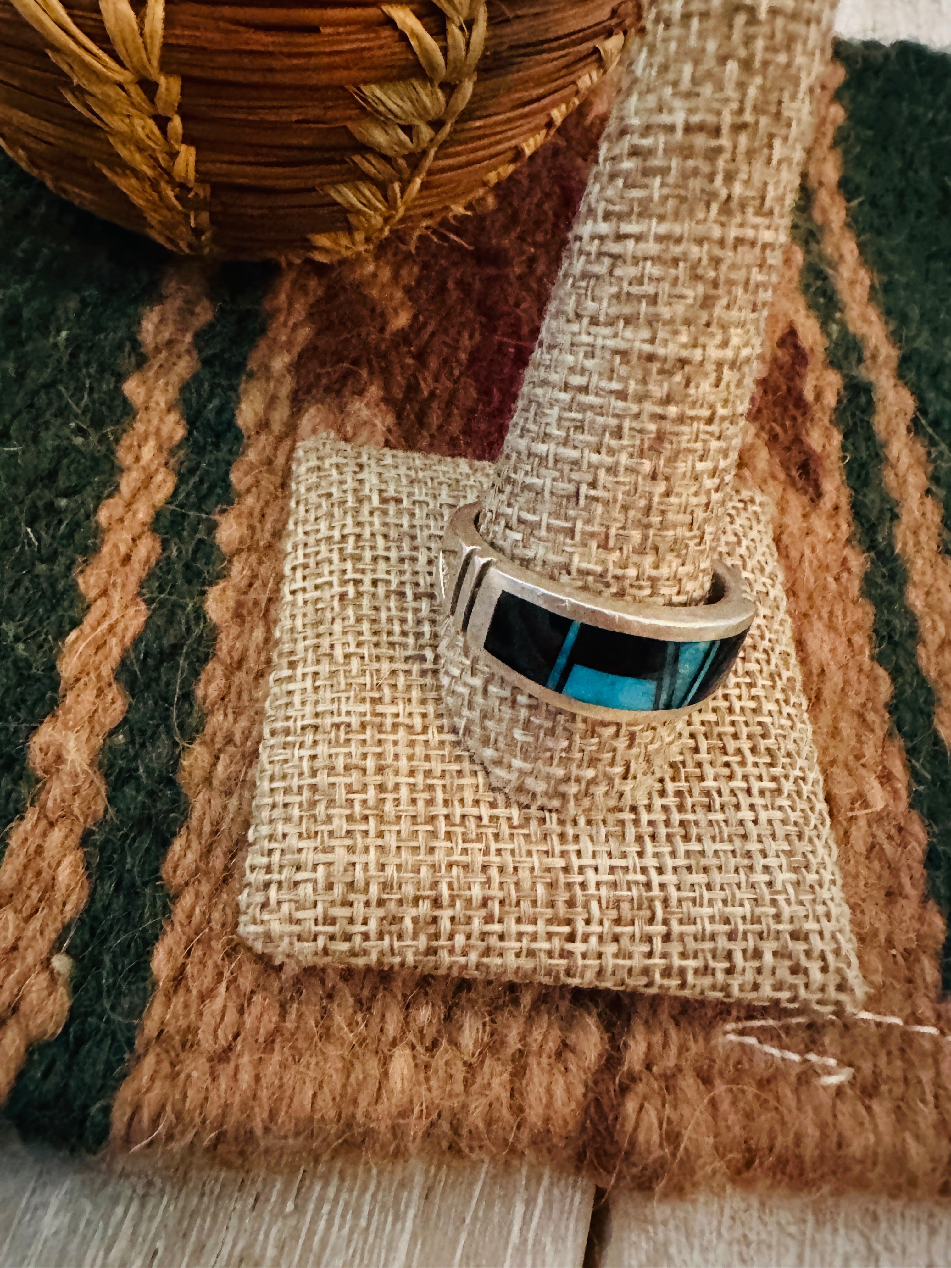 Beautiful Old Pawn Handcrafted Sterling Silver, Onyx and Turquoise Inlay Band Ring. Size 12. Measures 3/8 of an inch wide. Signed by the artist and stamped Sterling.