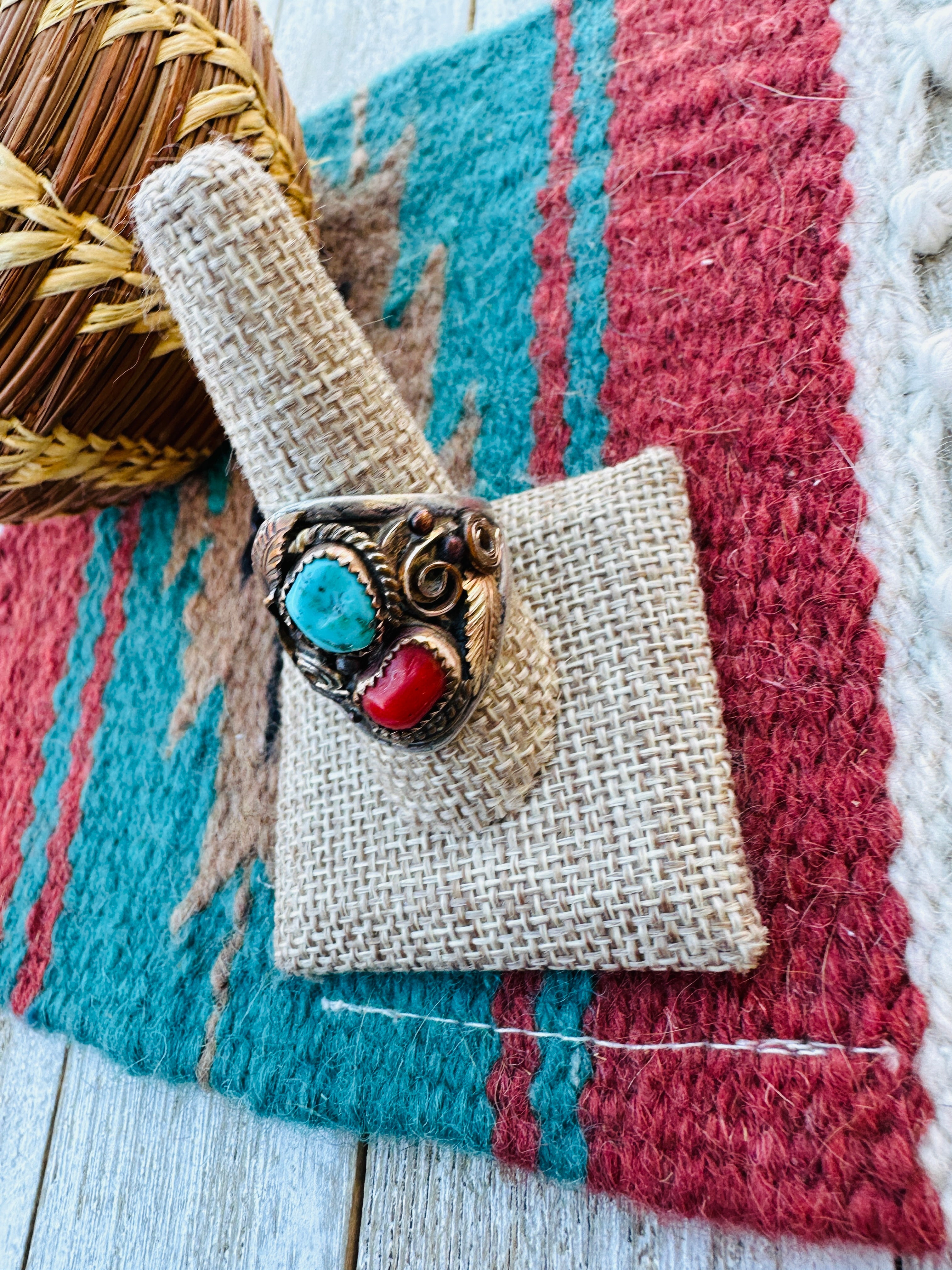 Old Pawn Handcrafted Turquoise, Coral & 14K Gold Overlay Sterling Silver Ring Size 10