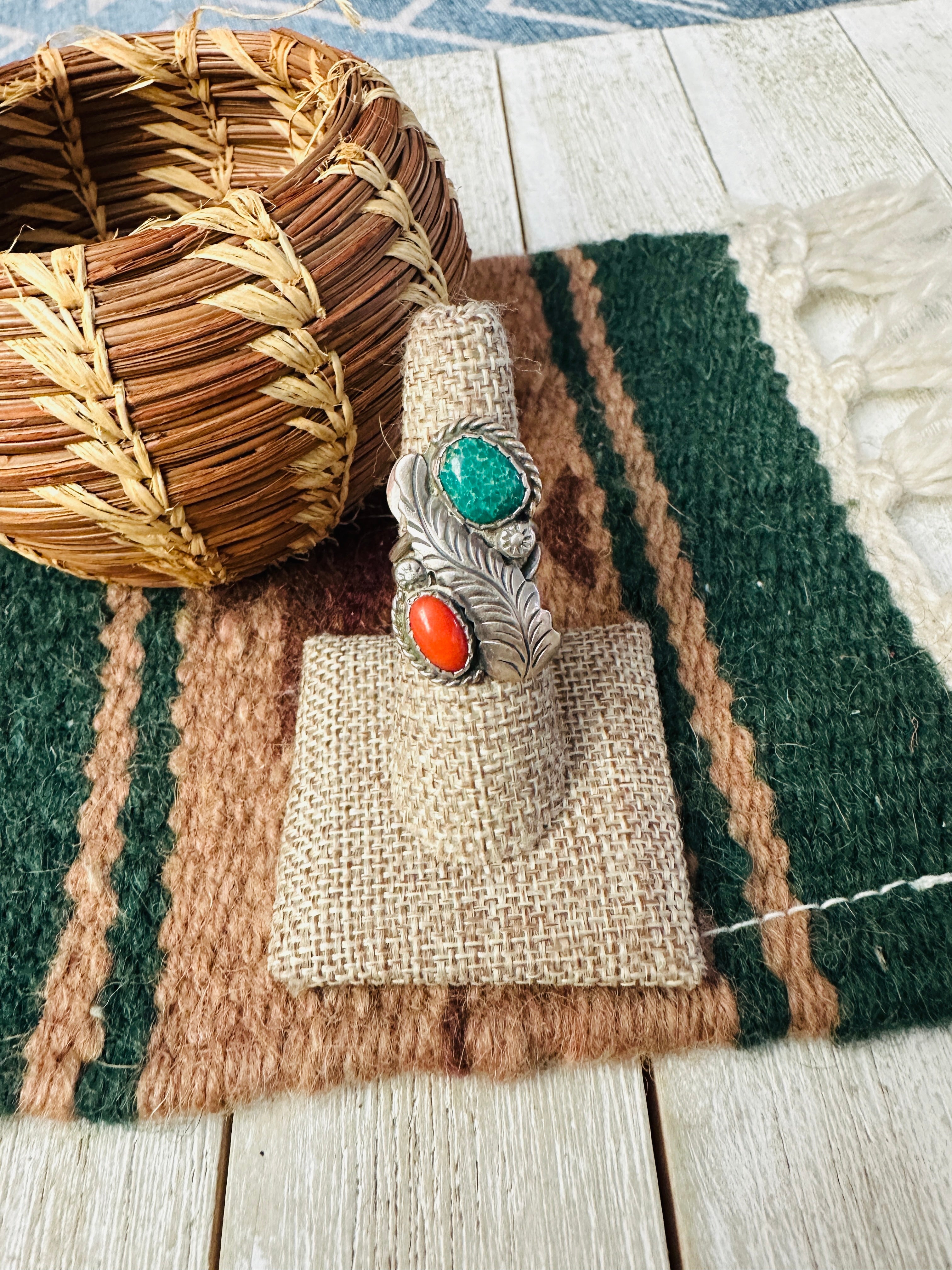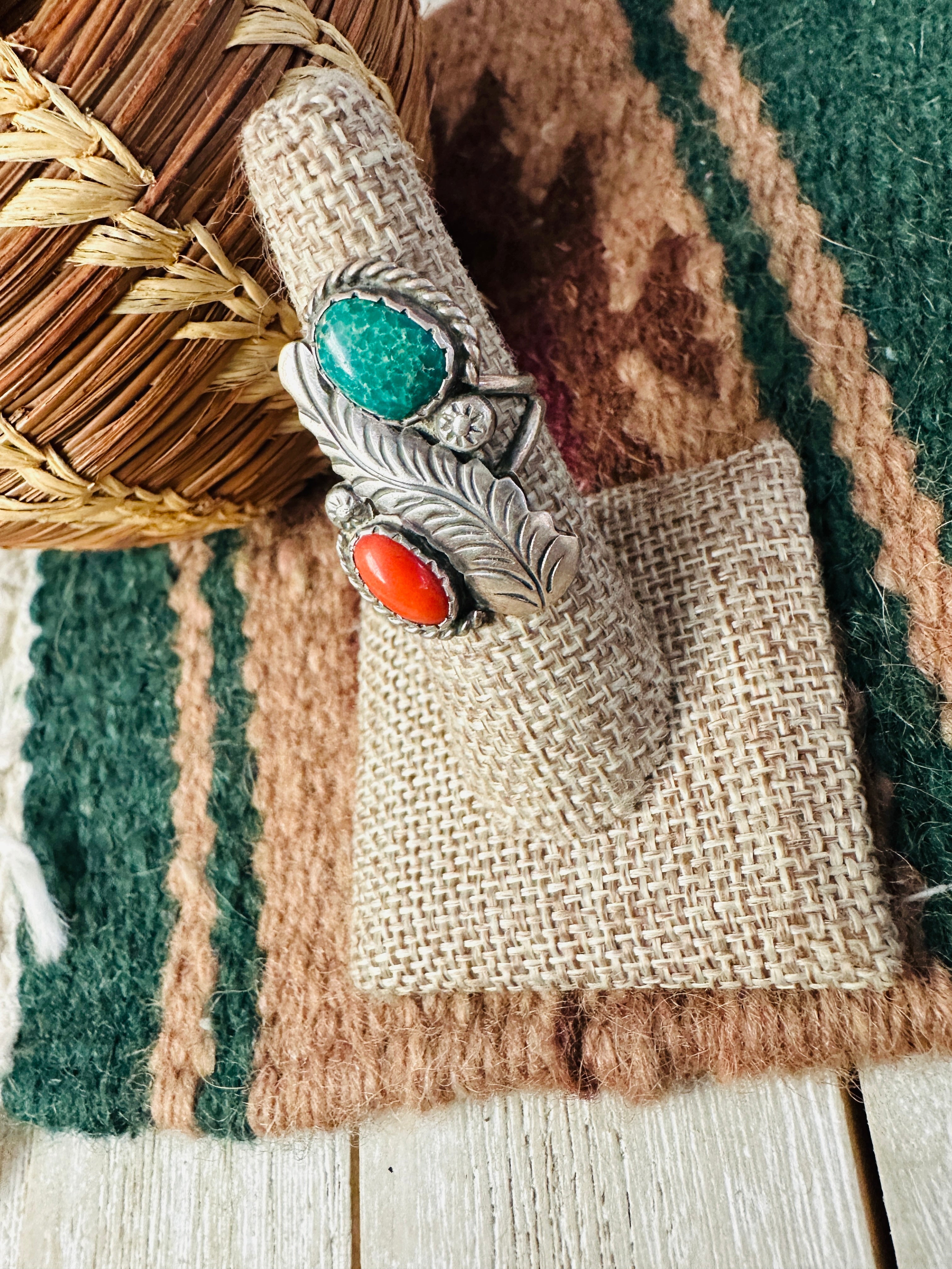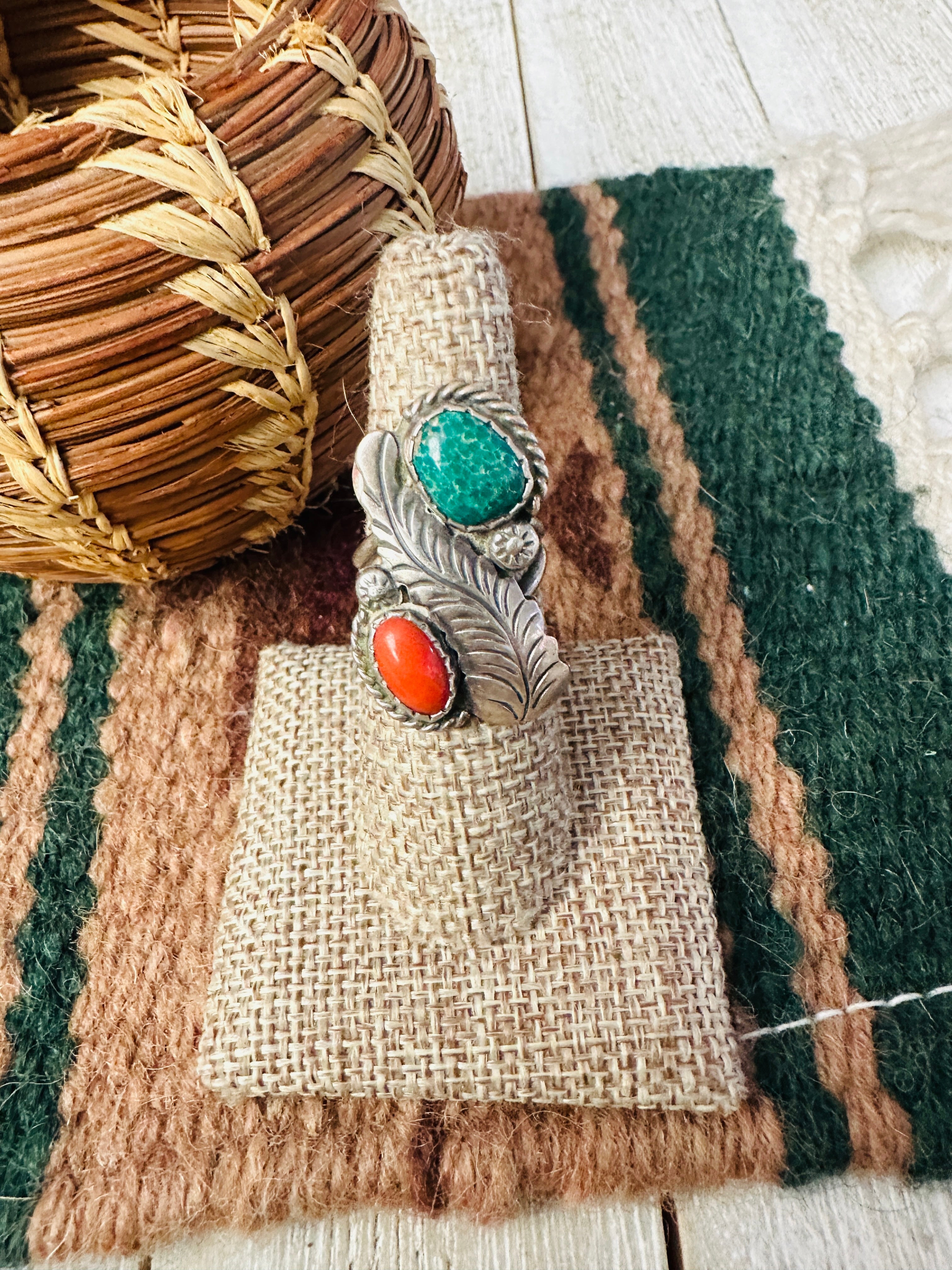 Old Pawn Handcrafted Turquoise, Coral & Sterling Silver Ring Size 6