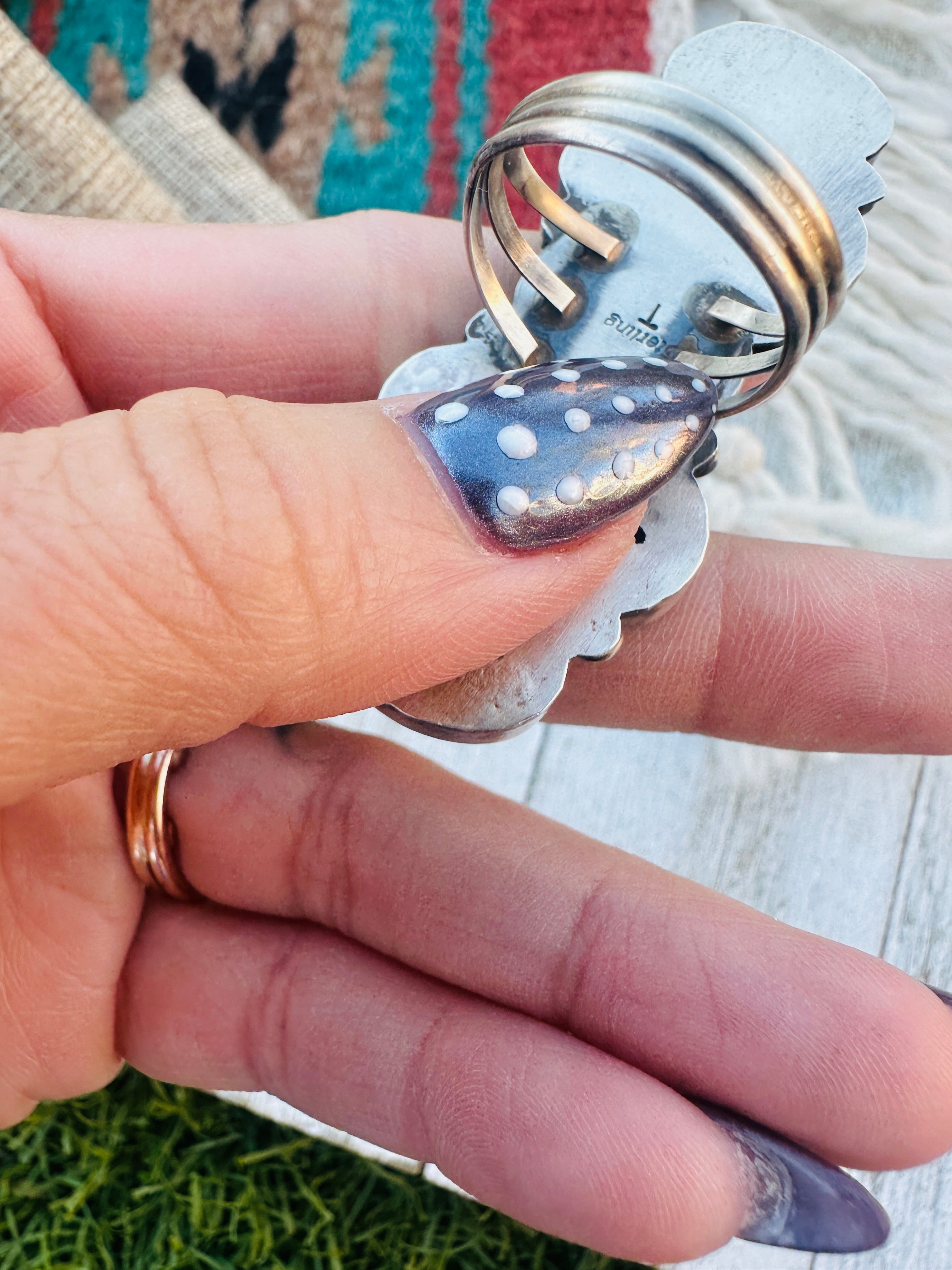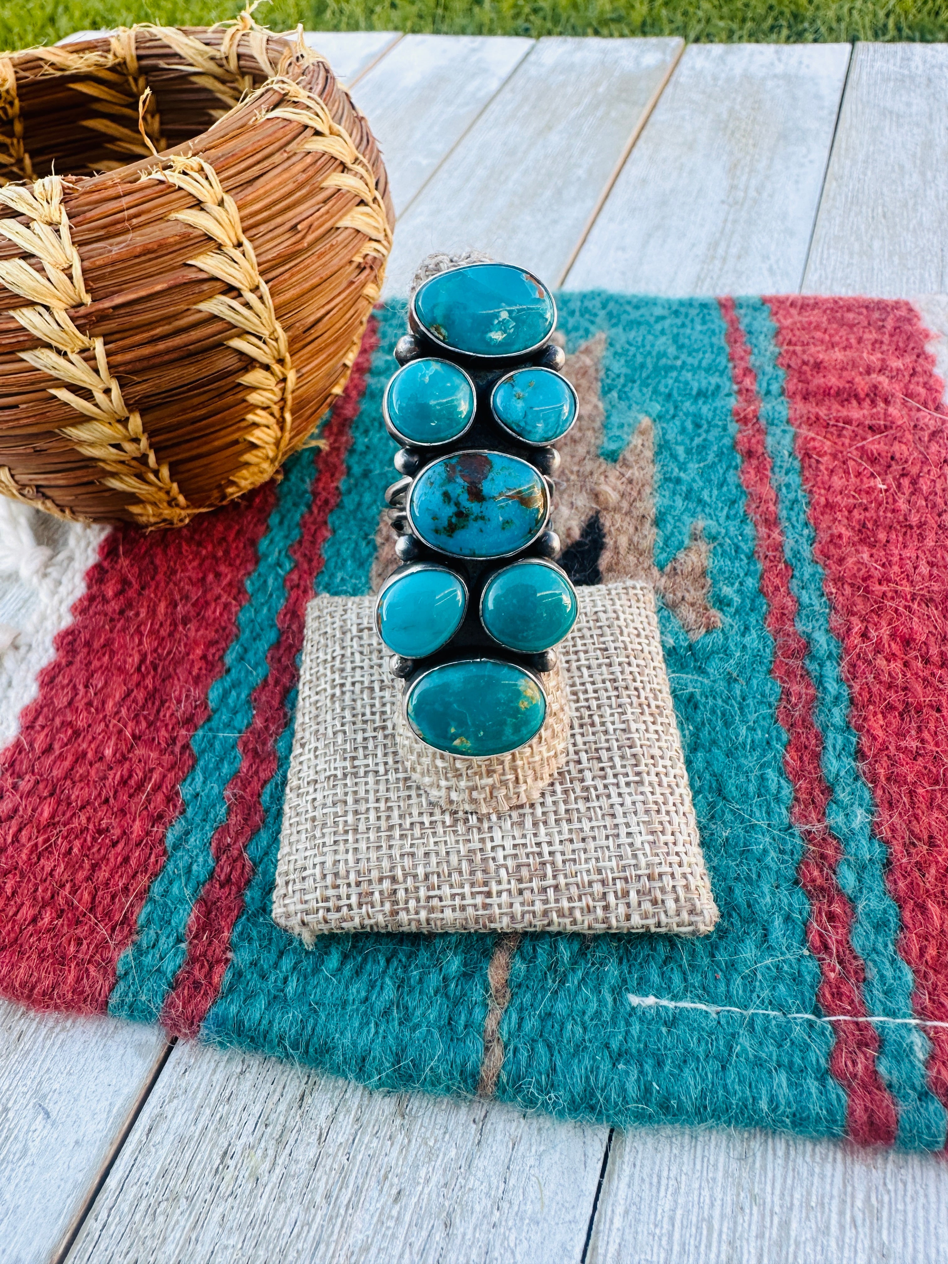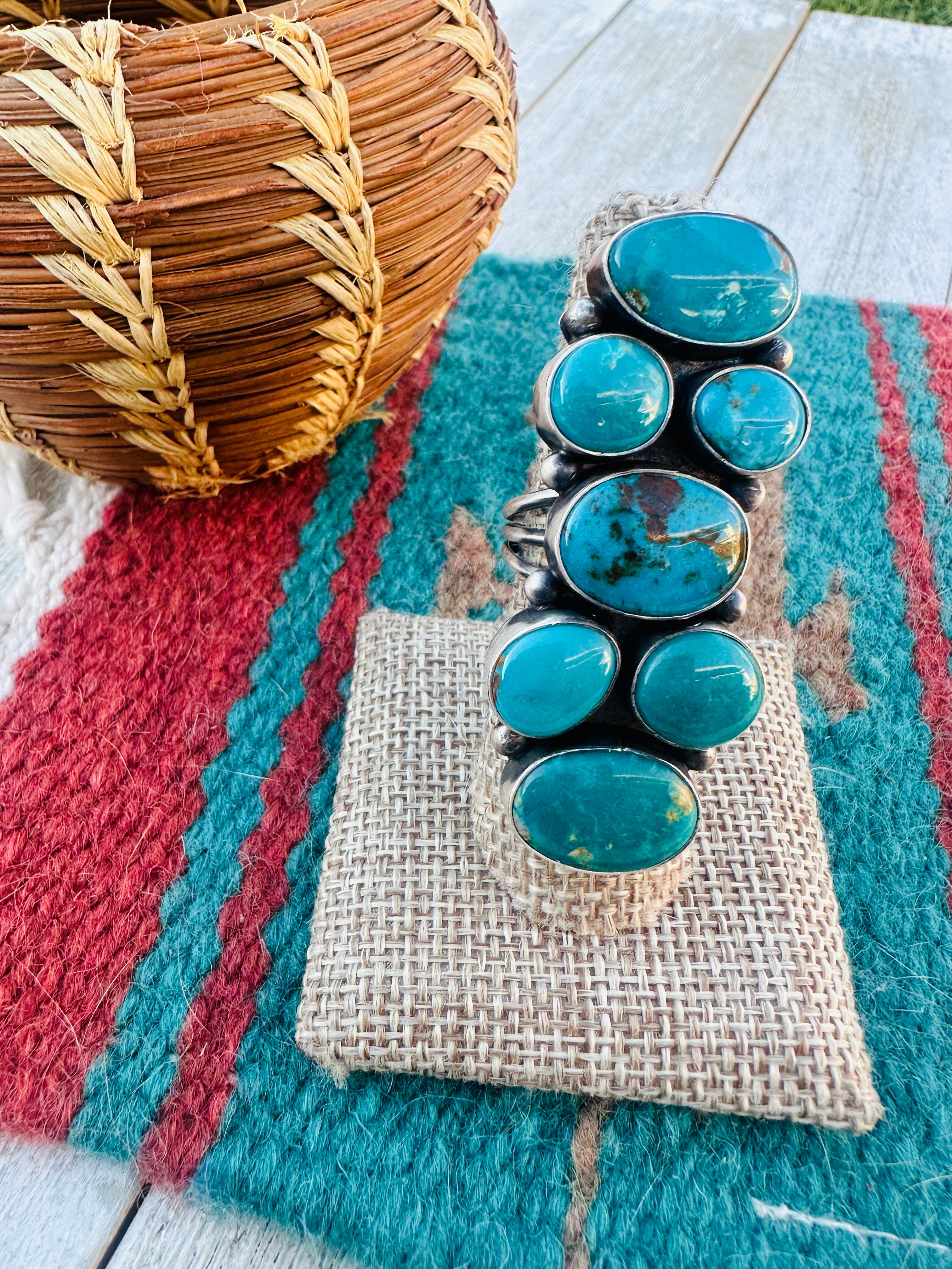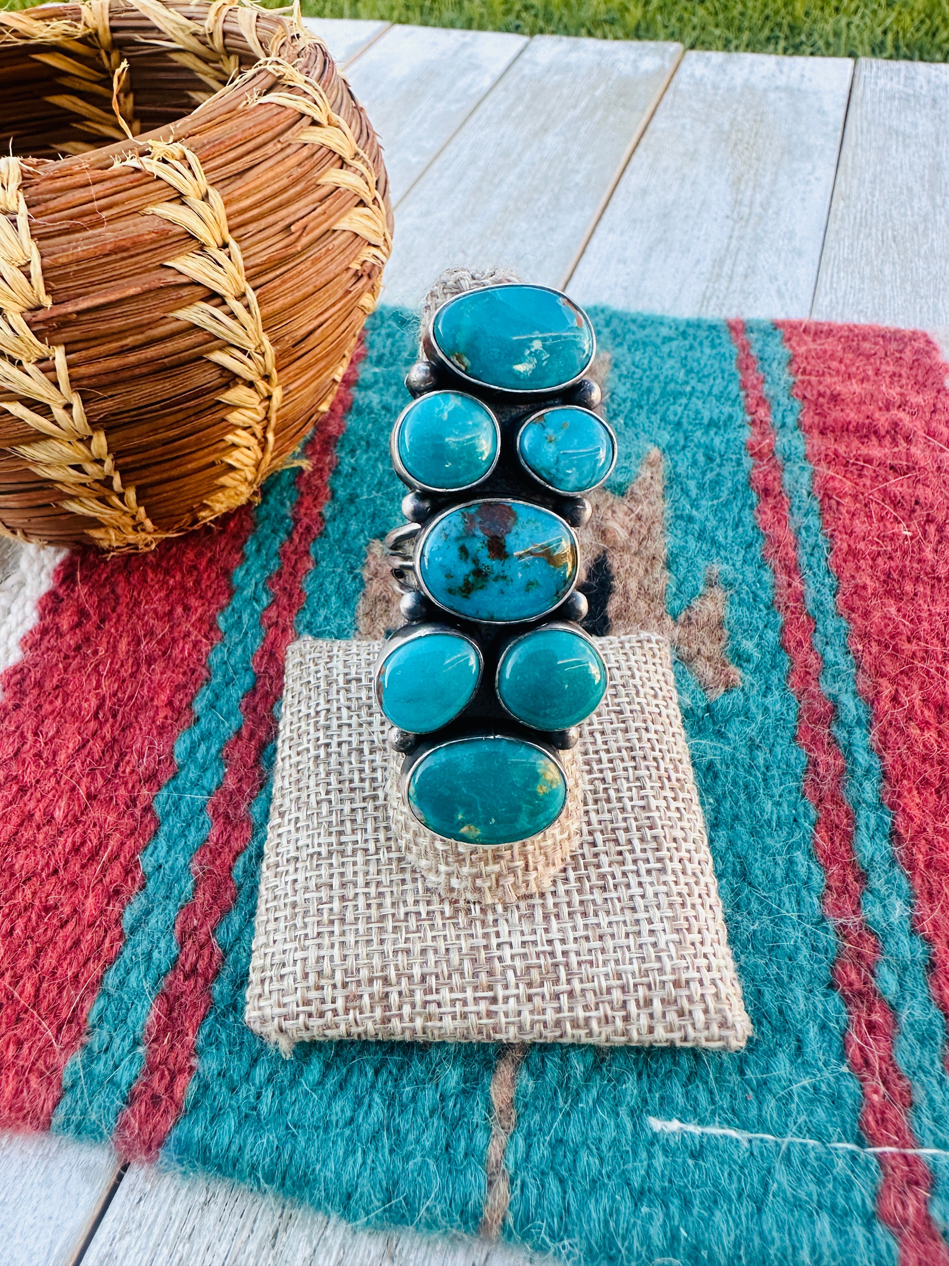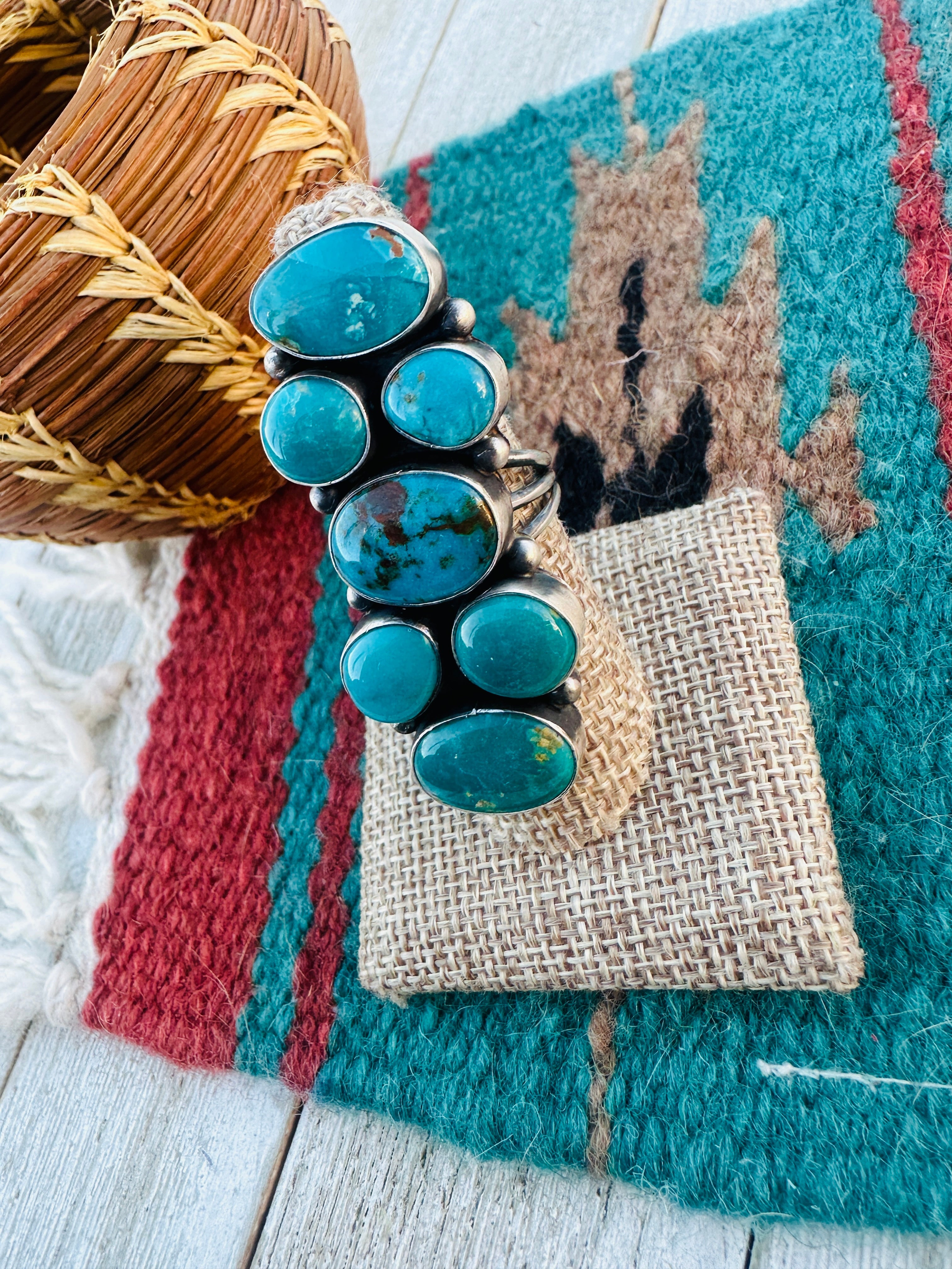 Beautiful Old Pawn Handcrafted Sterling Silver and Turquoise Cluster Ring. Size 8. Measures 2 1/4 inches long and 1 inch wide. Signed by the artist and stamped Sterling. Excellent condition!