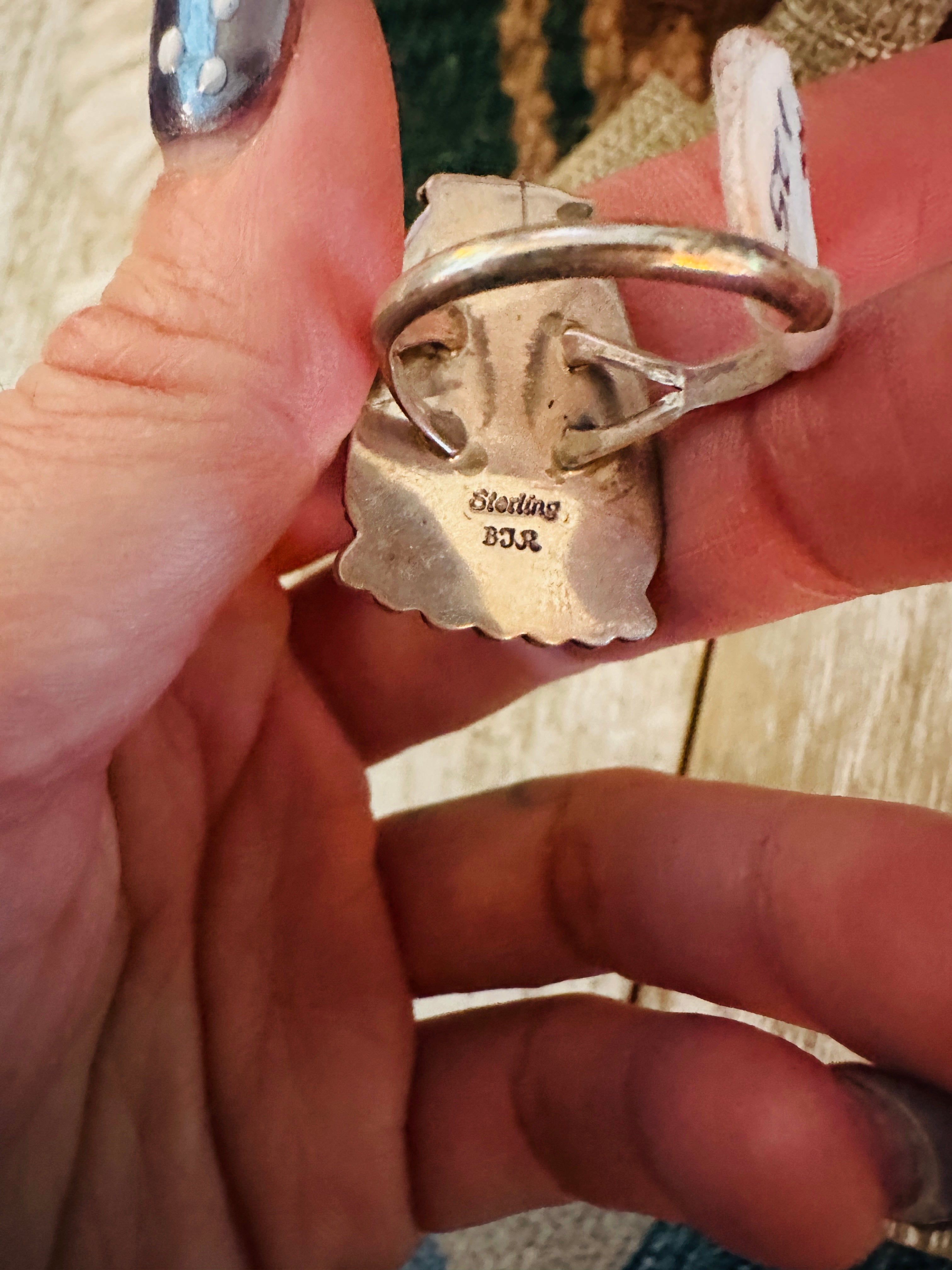 Beautiful Old Pawn Handcrafted Sterling Silver and Turquoise Ring. Size 8. Measures 1 1/4 inches long and 7/8 of an inch wide. Signed by the artist and stamped Sterling.