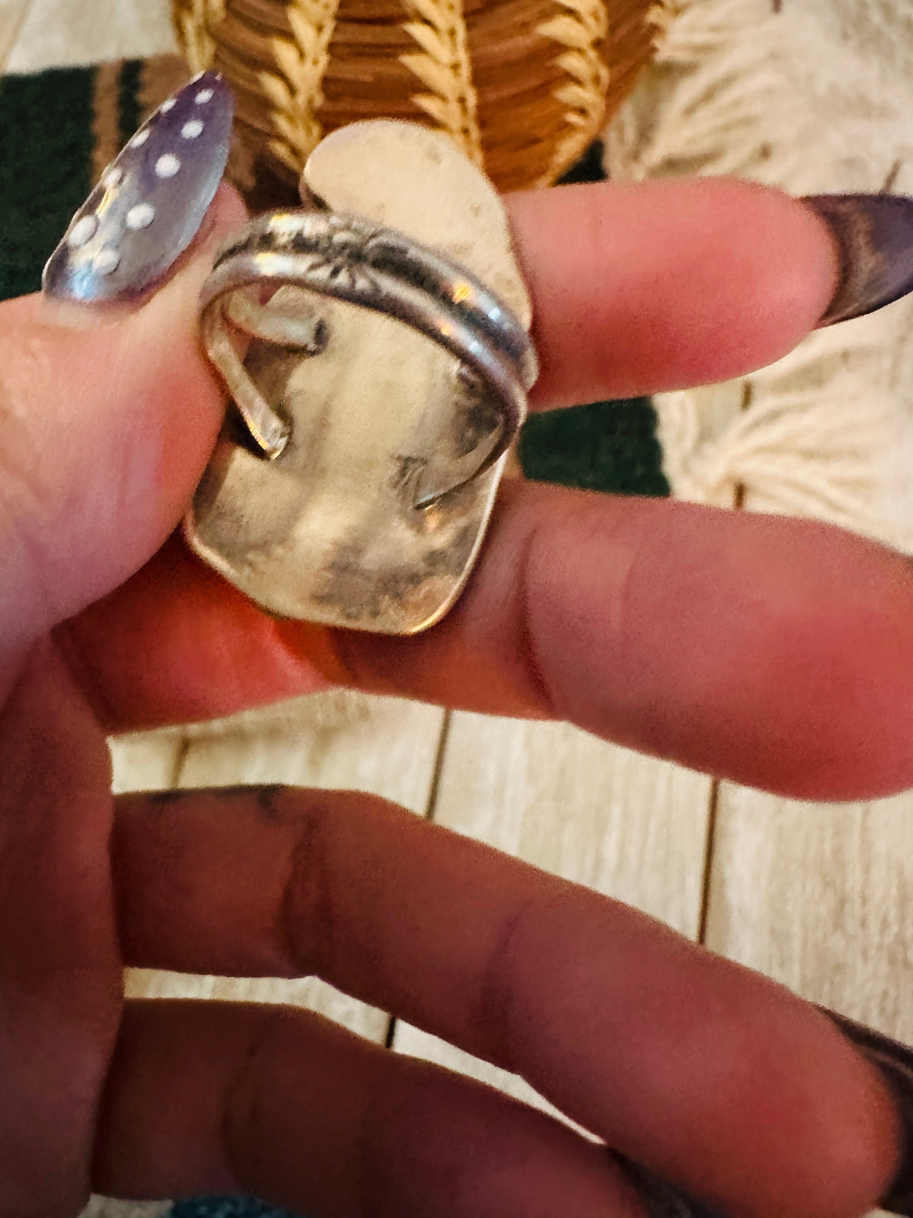 Beautiful Old Pawn Handcrafted Sterling Silver and Turquoise Ring. Size 6. Measures 1 1/2 inches long and 7/8 of an inch wide.