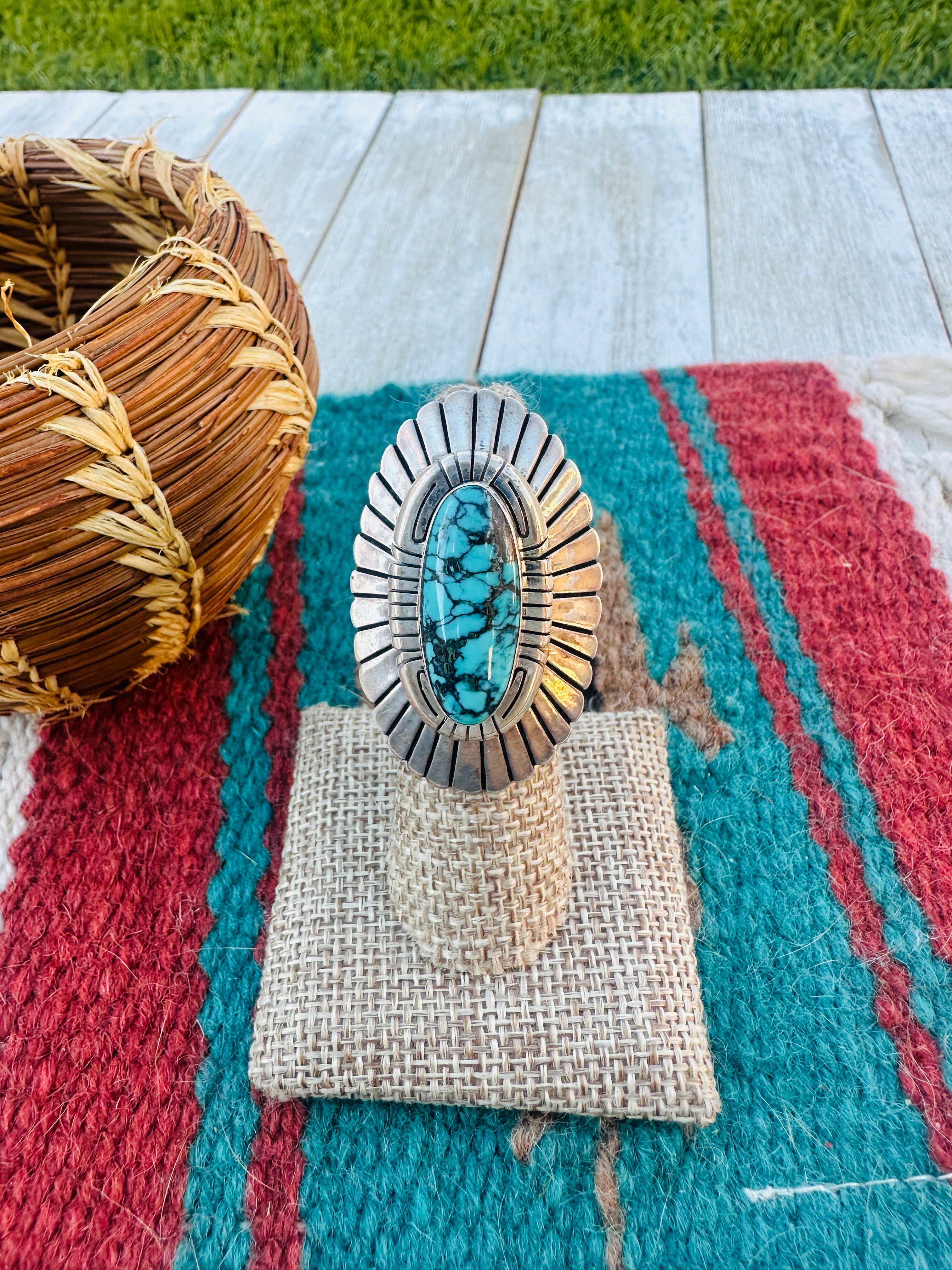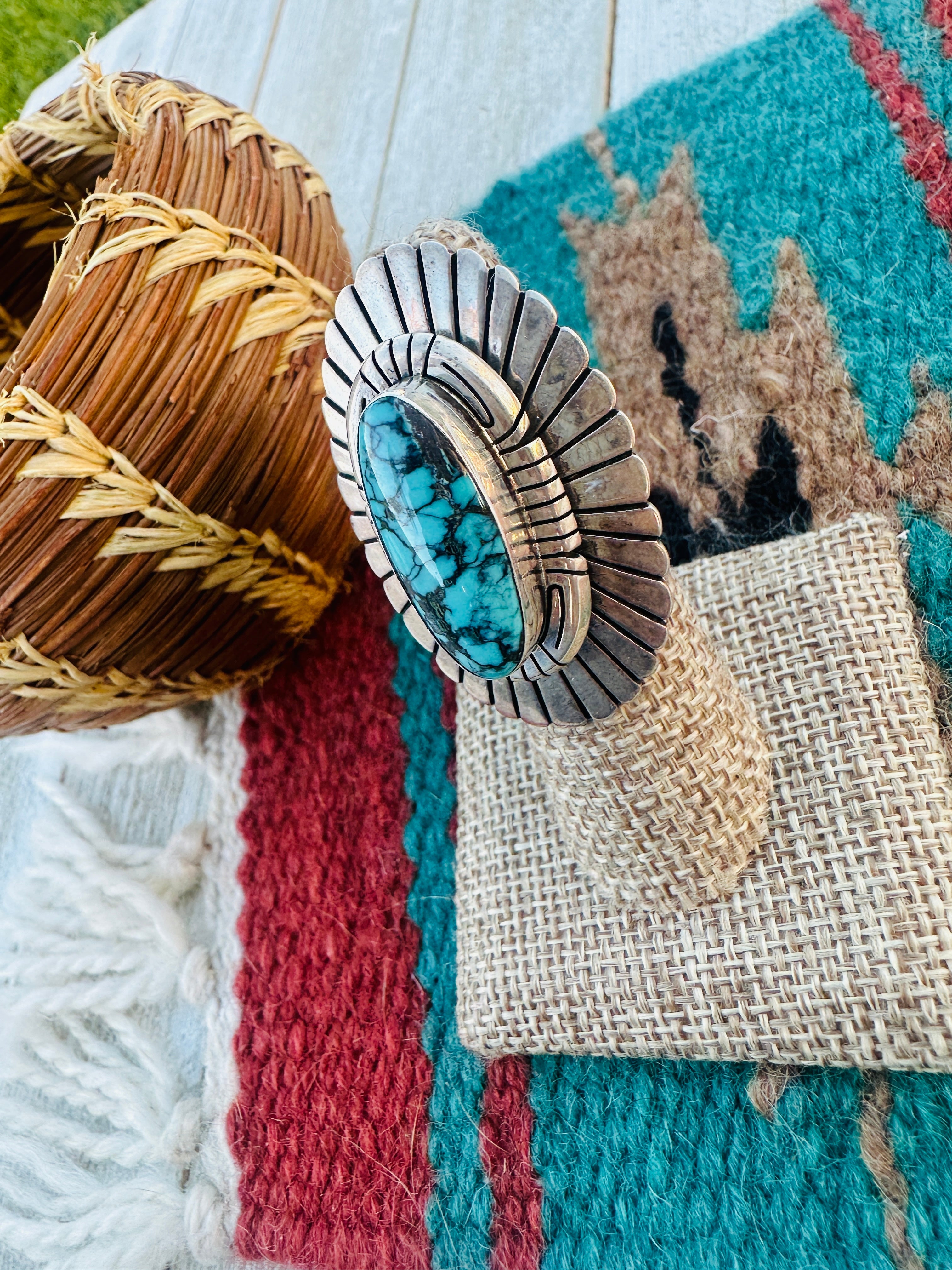 Beautiful Old Pawn Handcrafted Sterling Silver and Turquoise Ring. Size 6. Measures 2 inches long and 1 1/2 inches wide. Signed by the artist and stamped Sterling. Excellent condition!