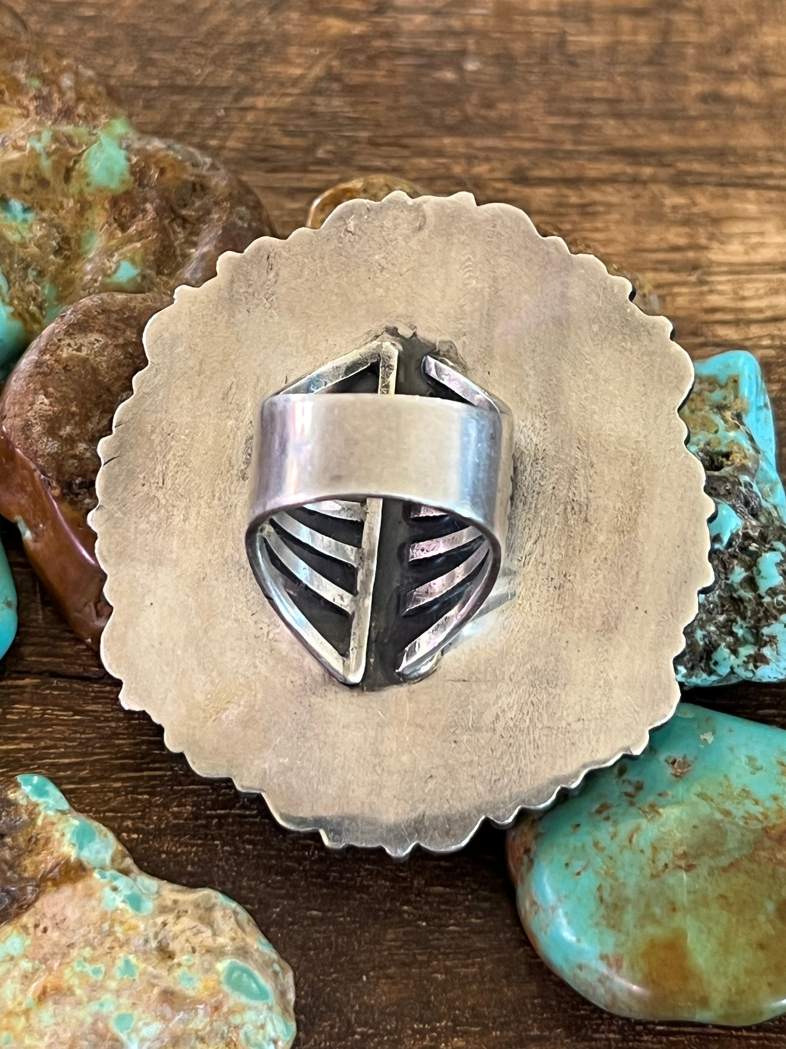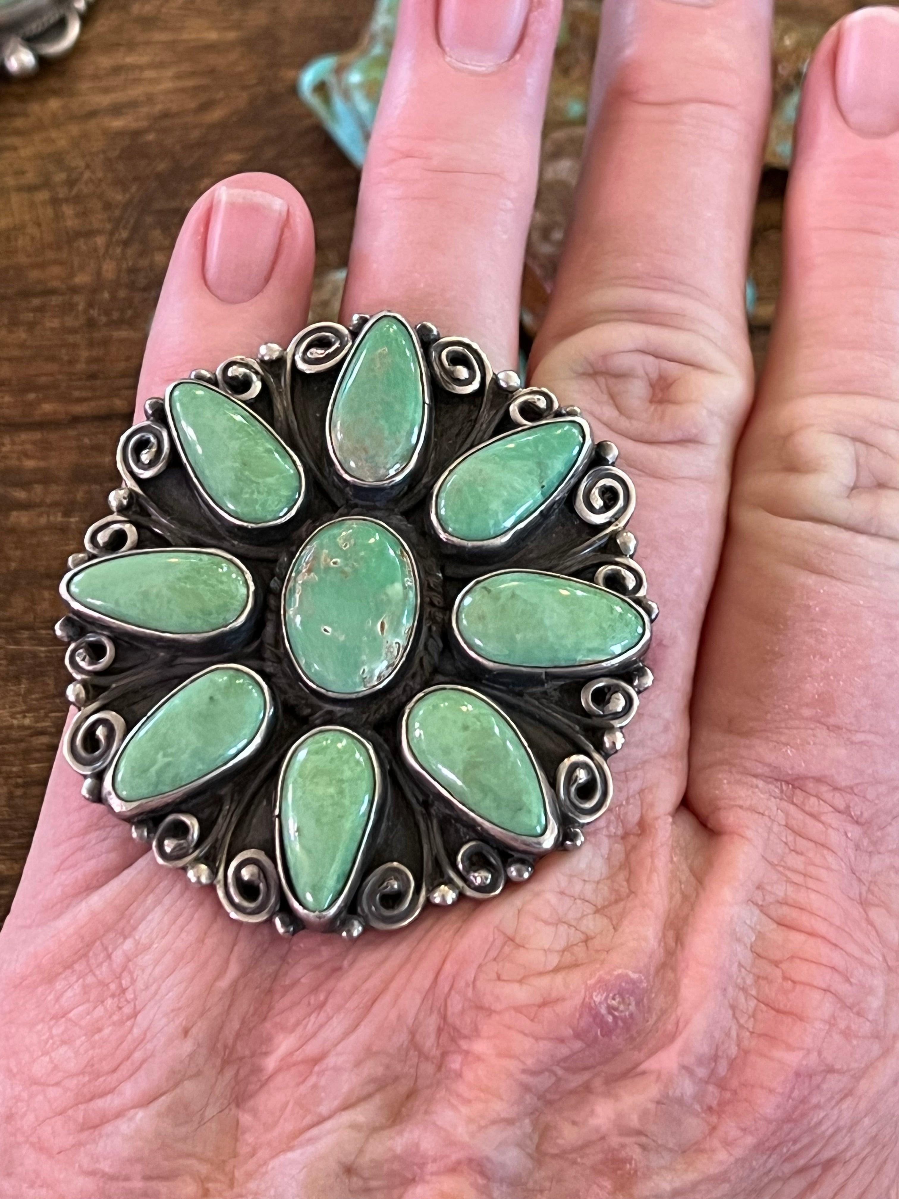 This old pawn sterling silver cluster ring features eight pear shaped turquoise pieces surrounding a lovely matching turquoise oval. The radiating stones are separated by fanciful wirework to complete a striking cluster design. The face measures 2-1/8 inches by 2 inches. It is adjustable but currently sits at a 7. The inside of the shank is stamped sterling and Verdy (New Mexico artist, Verdy Jake).