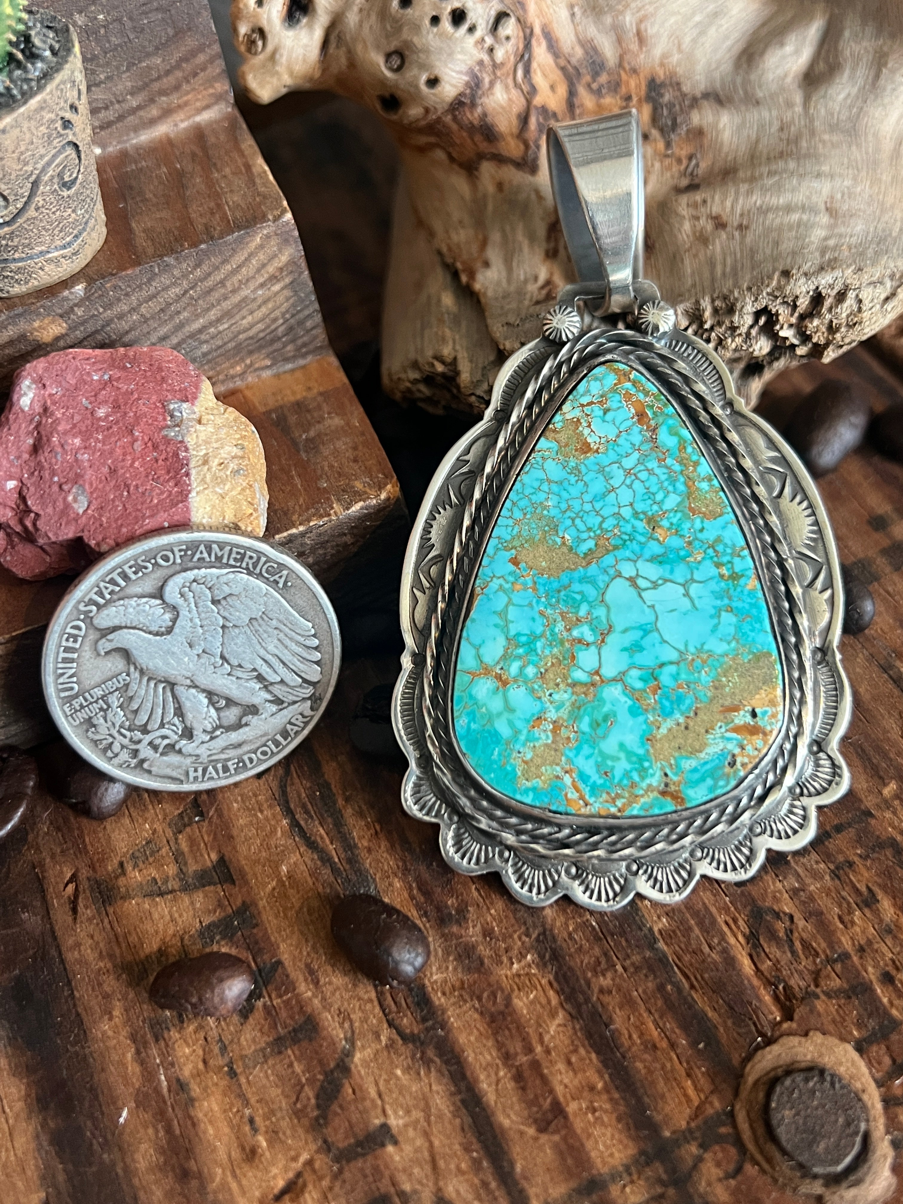 This gorgeous sterling silver pendant, made by Kimari Somers, features a moody piece of Royston turquoise surrounded by expertly stamped details and topped with a smooth bail. It measures 3-1/4 inches tall (including the bail) and 1-3/4 inches wide. The bail opening measures 20mm and is ready to hold your favorite chain or beads.