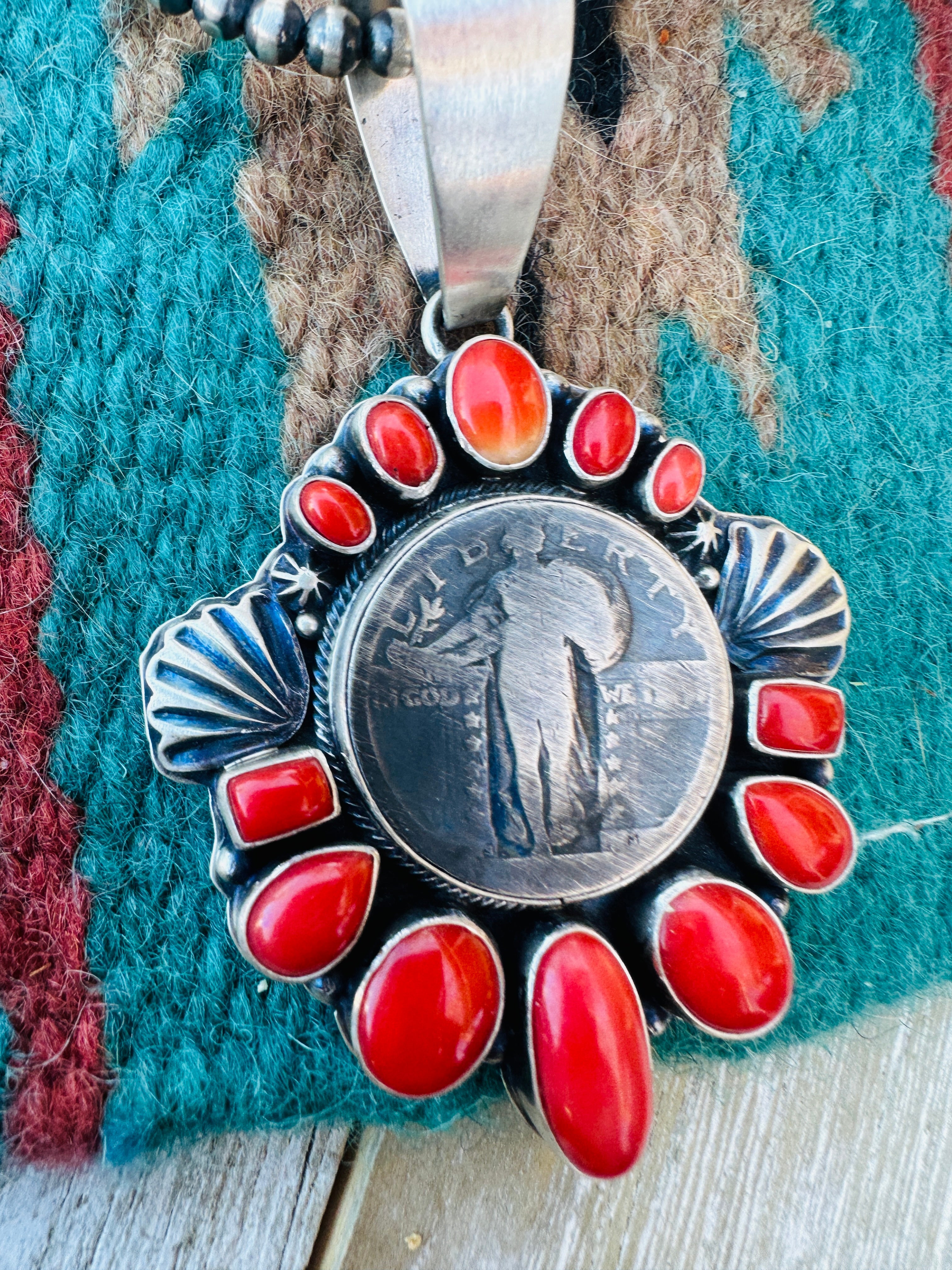 Beautiful Handcrafted Coral and Sterling Silver Liberty Coin Pendant. This pendant measures 3 1/4 inches long and 2 inches wide. Bale measures just under 5/8 of an inch across. Signed by the artist and stamped Sterling.